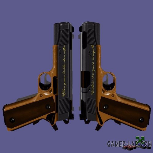 Similar 1. Two Colts HD - Два золотых Кольта в высоком разрешении. 2. Akimbo Barrett's - Две мощнейшие крупнокалиберные снайперские винтовки Barrett M82A1. 3. IMI Jericho 941 (Baby Desert Eagle) - Сделанный на основе Desert Eagle израильский компактный пистолет IMI Jericho 941, две штуки. 4. Colt Springfield Armory (4 skins) - Кольты производства Springfield Armory с дульным компенсатором. 5. TS Default Golden Colts Reskin - Рескин стандартных Кольтов в темный цвет с золотой и не только гравировкой.