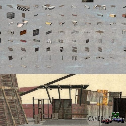 Куча мешей из half-life 2, превращенных в пропы, около 140. Вам стоит ожидать множество различных видов баррикад и прочего. |